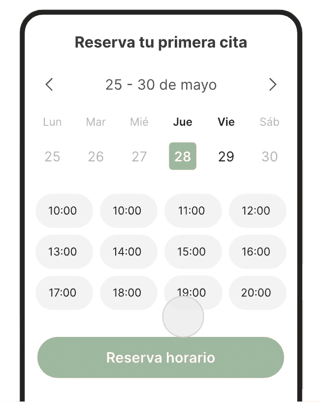 Sabemos que la rutina puede ser exigente. Por eso, te ofrezco la posibilidad de seleccionar tus sesiones en los horarios que mejor se adapten a tu día a día.